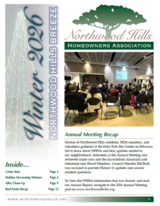 Want to see what’s happening in Northwood Hills? The Northwood Hills Breeze gets published and mailed to residents about four times per year with tons of useful information including details about new regulations or initiatives from the city, helpful tips related to the particular season we’re in, a community calendar, a real estate report, contact information for Board members, a bulk trash collection schedule, and much more! Local businesses advertise in it as well, which helps to underwrite the cost of the publication and showcases service providers who cater to Northwood Hills. Read our most recent newsletter. To find out about some of our recent projects, check out our blog posts below. To learn more about the benefits of membership, visit the Benefits page.